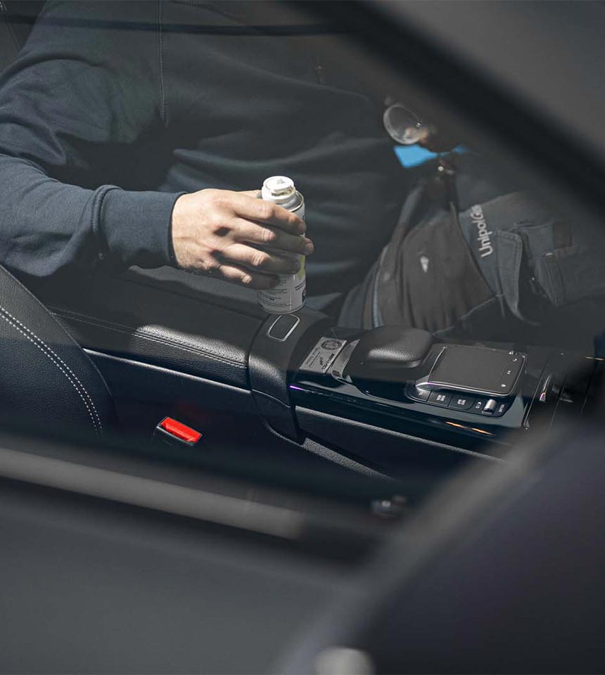 I nostri tecnici specializzati trattano il veicolo applicando un igienizzante a base alcolica e spray antibatterici, mantenendo il climatizzatore attivo in modalità di ricircolo. I prodotti utilizzati non intaccano le parti interne del veicolo e seguono le linee guida dell’ISS.